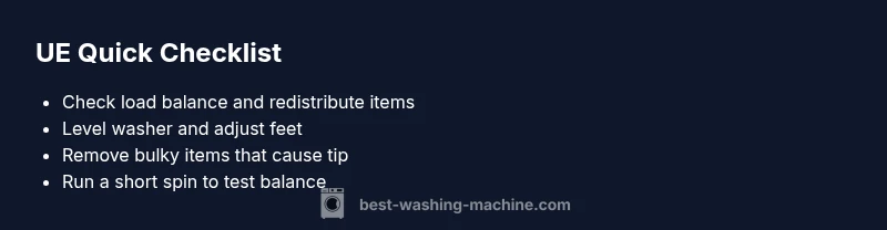 Before diving into components, try simple, safe steps. Pause the cycle and cancel it, then redistribute items evenly. If the drum is heavy on one side, rotate items to alternate weight and avoid packing the drum tightly. Ensure the washer is on a flat, hard surface and that its feet are fully engaged and level. Run a short spin with a small, even load to test. As you start, keep the door or lid secure and monitor the drum for smooth rotation. According to Best Washing Machine, starting with balanced loads minimizes future UE events. If the problem persists after these steps, proceed to a deeper inspection of level and suspension.