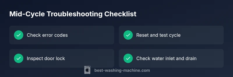 Most often, a washer stops mid-cycle due to a simple issue like a door lock, water supply, or a clogged pump. Start with a quick reset, verify the door is firmly closed, and check for error codes. According to Best Washing Machine analysis, many mid-cycle stops stem from low water pressure or a blocked drain. If it persists, proceed to the diagnostic flow.