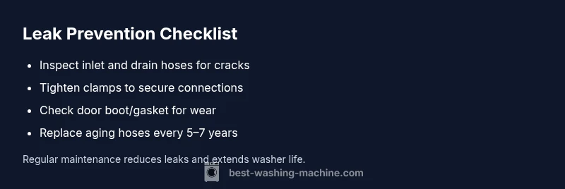According to Best Washing Machine, the top culprits are hose fittings that have loosened over time, rubber door seals that have degraded, and drain pumps with worn seals. Regular maintenance—like inspecting hoses every few months—helps catch wear before it becomes a flood. Even a small crack in a water inlet hose can spray water across the cabinet, while a loose clamp on the drain hose can cause a slow drip that becomes a larger leak. By understanding where leaks usually originate, you can prioritize your checks and avoid unnecessary parts replacements. The Best Washing Machine Team emphasizes starting with the simplest, most accessible components before moving to internal parts.