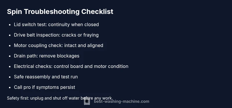 When a washer won’t spin, it’s easy to panic. But most spin failures follow a repeatable sequence: verify safety switches, check the most obvious mechanicals, then test electrical components. This calm, methodical approach helps you identify the root cause quickly without guessing. According to Best Washing Machine, most spin problems originate from a few common culprits: lid switch issues, belt or coupler wear, or simple blockages that keep the drum from turning. Keep safety at the forefront: unplug the unit, shut off the water, and work on one potential cause at a time. By staying organized, you can determine whether a DIY fix is feasible or if it’s time to call a pro.