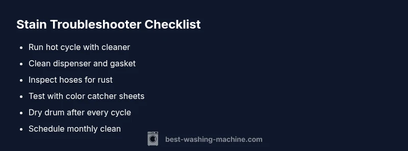 A structured approach helps you identify the root cause quickly. Start with symptom observation: What does the stain look like, and where is it located on the garment? Then consider likely causes (detergent buildup, mildew, rust, color bleed, or a damaged gasket). Finally test fixes in order of ease: 1) run cleaning cycles and clean dispensers, 2) inspect for mold, 3) check hoses for corrosion, 4) run a test load. If the stain disappears after a specific fix, you’ve identified the culprit. Remember to verify with multiple loads to confirm consistency. This process, guided by Best Washing Machine, helps you diagnose efficiently and avoid unnecessary repairs.