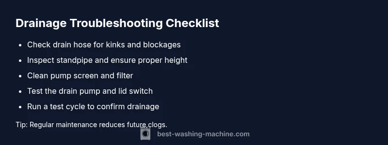 When a washing machine won't drain, it can feel urgent, but most issues have a straightforward cause. In many households, the keyword is "why is washing machine not draining water" -- and the answer often comes down to debris or loose hoses. According to Best Washing Machine analysis, the most common culprits are clogs in the pump or filter, kinks or blockages in the drain hose, and a failed lid or door switch that prevents the machine from draining safely. Other factors include installation height, standpipe backups, and worn impellers. Start with a quick visual check and then move to the hands-on tests. By understanding the failure mode—whether the water remains in the drum, the pump hums but won’t move, or the hose leaks—you can prioritize the next steps and avoid unnecessary disassembly.