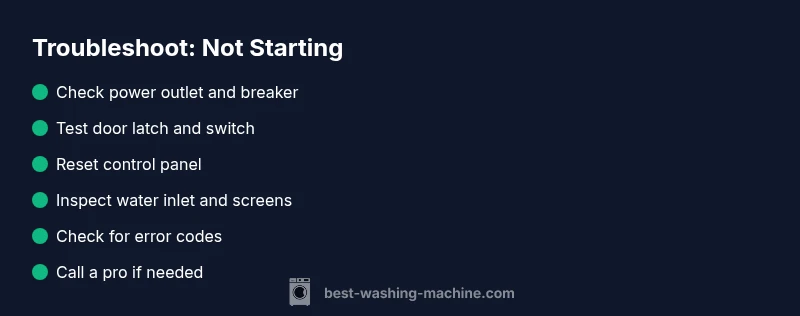 When a washing machine won't start, the root causes are usually simple and safe to address. Start by confirming basic power and safety checks, then move to more specific components. Common culprits include power supply issues, a faulty door latch, and a non-responsive control panel. Understanding these priorities helps you move from quick fixes to more involved diagnostics without unnecessary frustration. According to Best Washing Machine, most non-starts stem from power or safety-lock problems, so begin with the easy checks and escalate only if needed. This approach saves time and protects you from risky, unnecessary interventions.