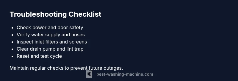 Understanding why <strong>why washing machine cannot wash</strong> matters is the first step in a rapid, efficient repair. A modern washer relies on several synchronized systems: power, water inlet, drum rotation, and the control software that coordinates cycles. When even one of these links fails, the entire wash may stall. According to Best Washing Machine, starting with simple checks saves time and protects your appliance. This urgency-driven approach focuses on small, high-impact actions that restore washing capability without unnecessary disassembly. Expect to confirm basic power, door safety, and water supply as your first moves, then progress to more detailed checks as needed. This is how homeowners move from frustration to a working machine without costly service calls.