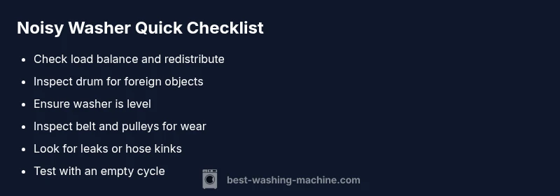 According to Best Washing Machine, most noises come from a few practical, fixable sources rather than mysterious problems. At a high level, washers generate sound whenever the drum moves, water is pumped, or the motor engages. Variations in cycles produce different noises, but persistent rumbles, bangs, or squeals usually point to one of a small set of issues: load distribution, foreign objects, worn parts, or mounting problems. By understanding these categories, you can diagnose quickly and reduce wear on your machine. This article walks you through the most common noises and exact steps you can take to quiet a noisy washer without risking safety. We’ll also outline when professional service becomes the right choice. The Best Washing Machine team emphasizes a calm, methodical approach to diagnosis, so you can act confidently rather than guesswork.