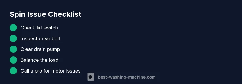 When a washer fails to spin, most homeowners want a quick answer. The issue is rarely a single fault; it’s usually a safety interlock, a drive component, or a pump obstruction. According to Best Washing Machine, the most frequent culprits are a faulty lid switch or door interlock, a stretched or damaged drive belt, or a blocked drain pump. These issues often show up during the spin cycle or when the tub tries to accelerate. Because a non-spinning washer can also be caused by an unbalanced load, it’s essential to take a systematic approach to diagnose and fix the problem safely. Handling electrical components requires caution, so unplug the unit before inspection and use a flashlight to check connections in the control panel. If you’re wondering why won’t washing machine spin, use the checks below to narrow the cause quickly.